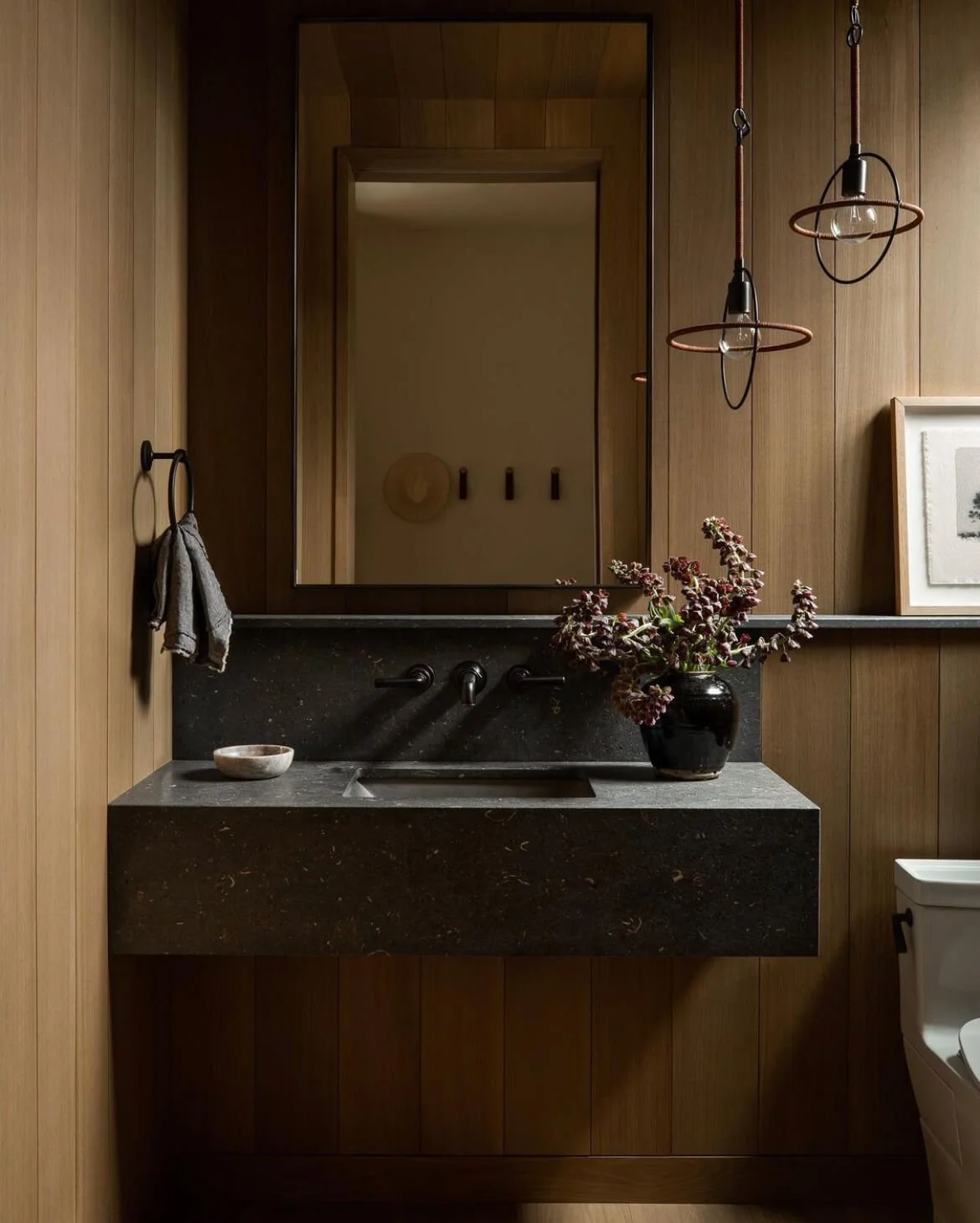 We love this moody look, achieved by combining a dramatic marbled slab with dark walls from Lisa Staton Design: