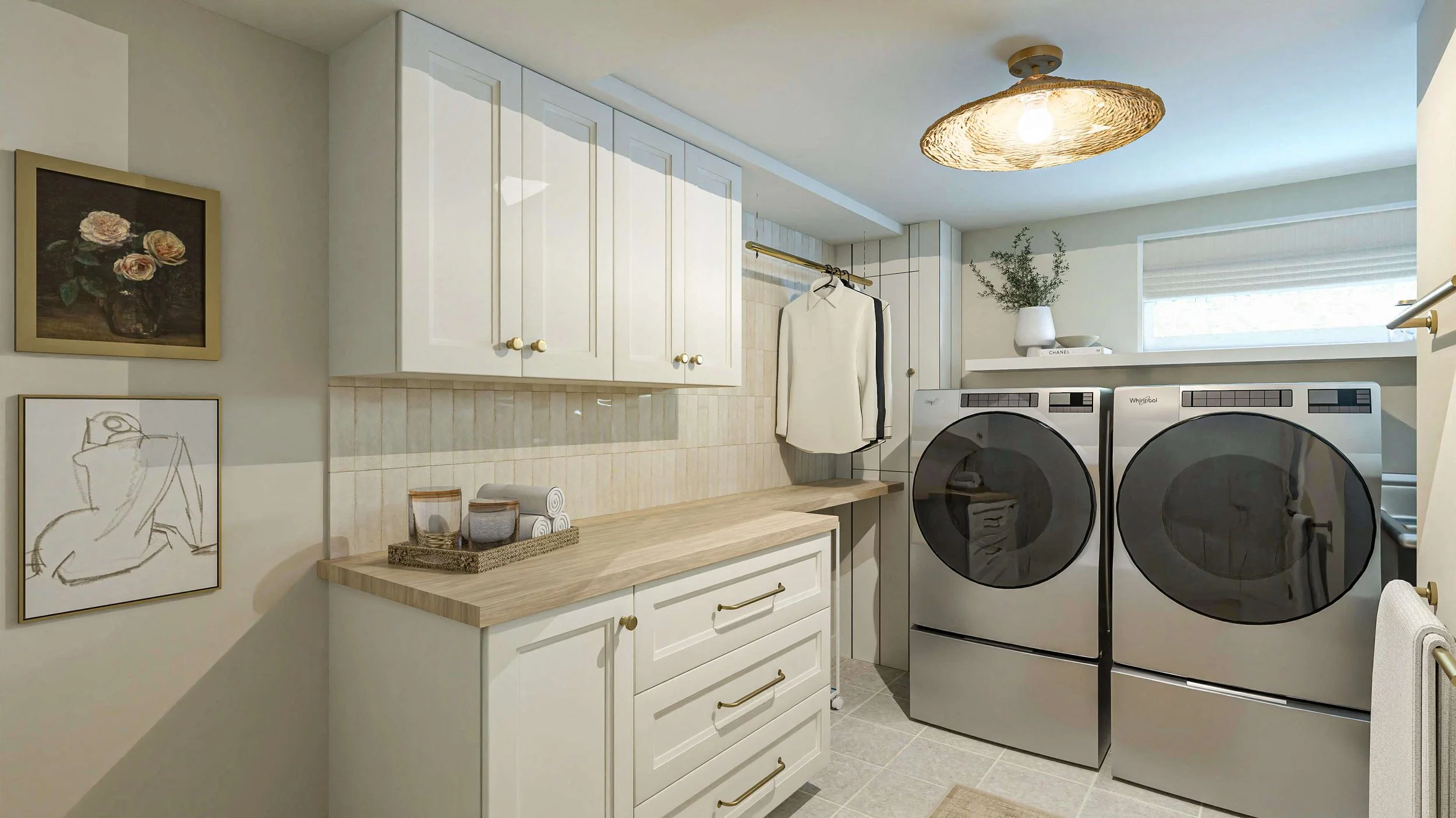 A butcher block countertop adds warmth and provides ample folding space, complemented by vertically installed sand-toned tile that visually elongates the walls and softens the look of the low ceiling. The window wall was elevated with a floating shelf and a tailored linen Roman shade, creating a simple yet elegant focal point. Across the room, new enclosed storage balances the layout and conceals what was once an uneven corner, making the space feel more intentional and streamlined.