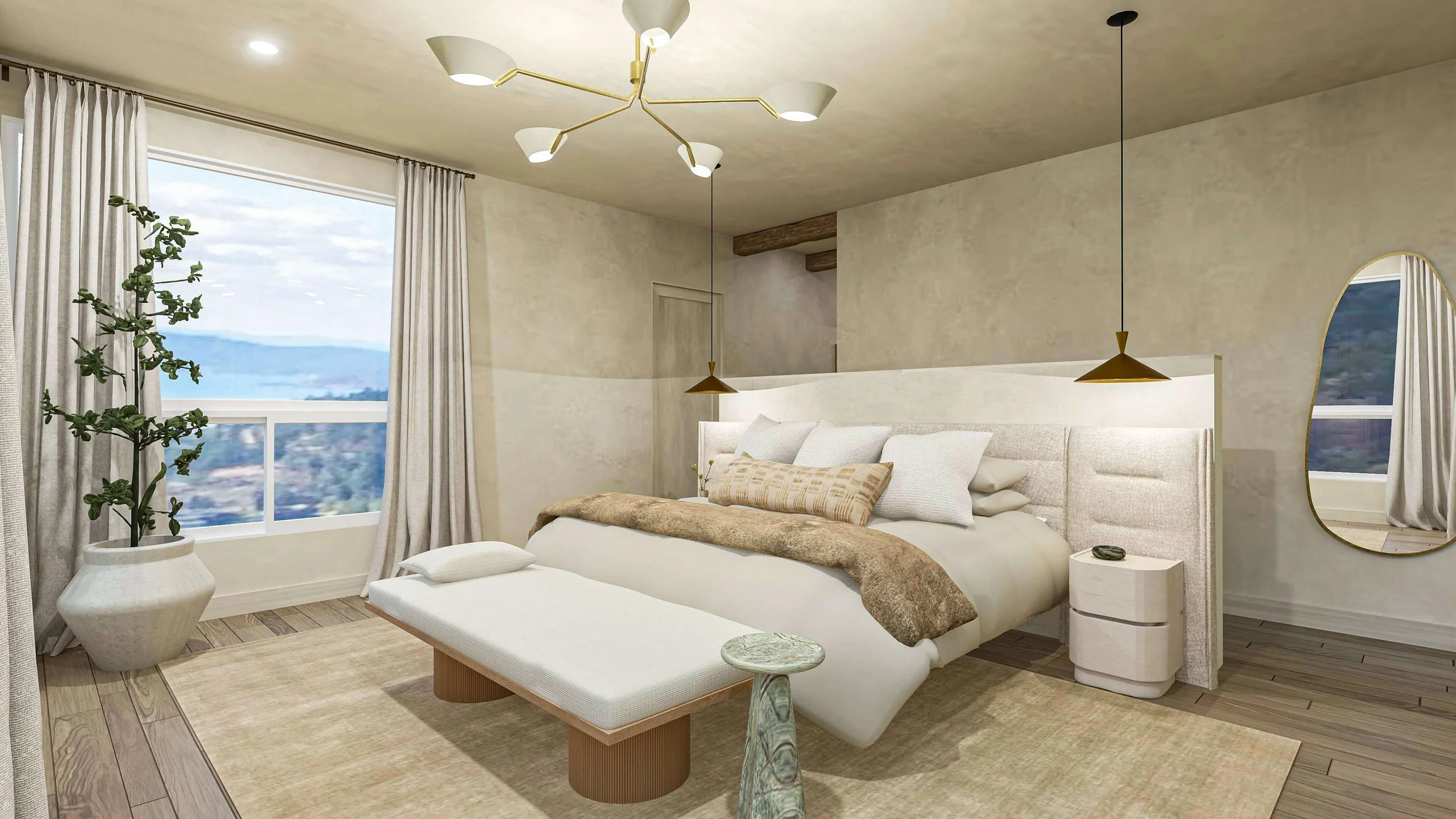 To redefine the space, architectural adjustments were made to enhance balance and functionality. The headboard wall height was reduced and extended on both sides to allow for properly scaled nightstands with storage, improving both proportion and usability. The entry hall was refined with exposed wood ceiling beams and a large artwork paired with picture lighting, creating a sense of arrival and flow. The pendant lighting above each nightstand adds a modern touch while freeing up surface space, and drapery across all windows softens the abundant natural light.